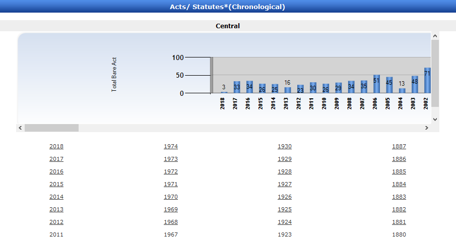 Clicking on Chronological index shows the Bar Chart & yearwise listing of the Bare Act. One can click on the number appearing on the Bar to view Acts appearing in that year.