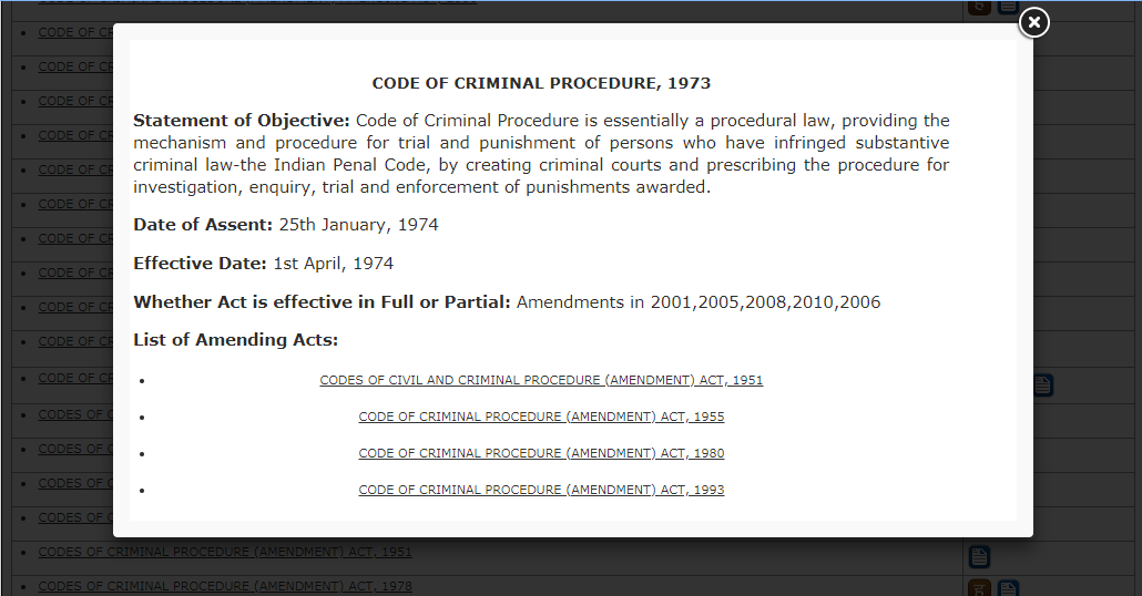 When we click on the Act with the Parliament sign, the Act displayed shows a a flag on the top. This flag denotes that there is a proposed bill pending in the parliament pertaining to the Act.