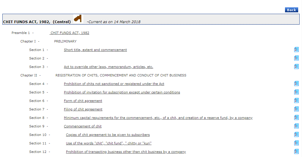 The Flag will also appear against the section of the Act, which will be amended by the Pending Bill in the Parliament. By clicking on this flag we can view the relevant clause of the pending bill. Clicking on the flag sign displays the Table of Content of the relevant Bill which is pending in the Parliament, as shown below.