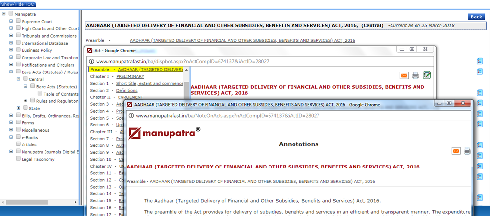 When we click on the Act, there is a Maroon colour icon which appears across in front of the Section/Order/ Article. Click on the icon to view the Commentary on that particular Section/Order/Article. These will appear only in Acts, for which commentary is available.