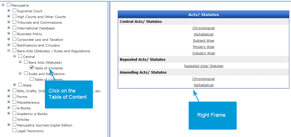 on Table of Contents. The Bare Acts are listed in the right frame under Alphabetical, Chronological, Subject