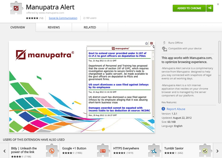 Desktop Alert on Chrome service is a complimentary service from Manupatra designed to help you stay connected with snapshots of legal events on all working days. It is a rich internet application that resides on your chrome browser and is managed by the server component of our platform.