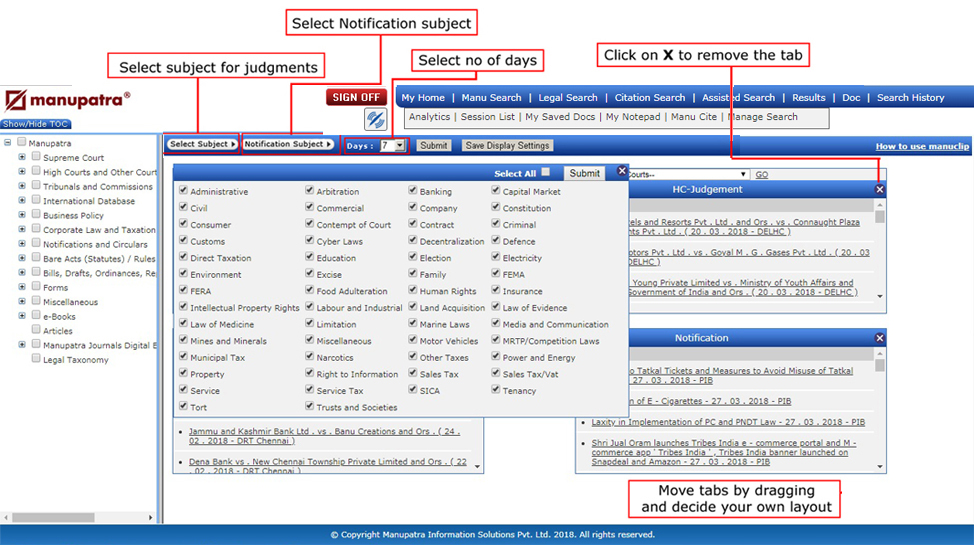 - Manage the placement of Judgment/ Notifications as per your wish. You can also move/remove the tabs if you do not wish to see it.