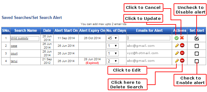link for the Search Name you wish to set an alert for. Select the number of Expiry Days ( this is number of days for which you wish to receive Alerts for the subject search query). Click on