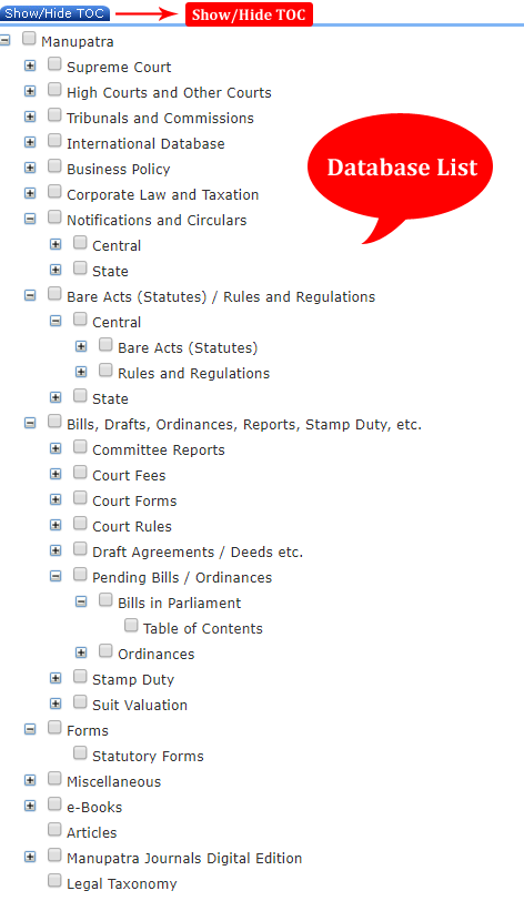 Table of Content [TOC], which lists the Databases. Headings may be collapsed or expanded individually by clicking on the + and - icons.