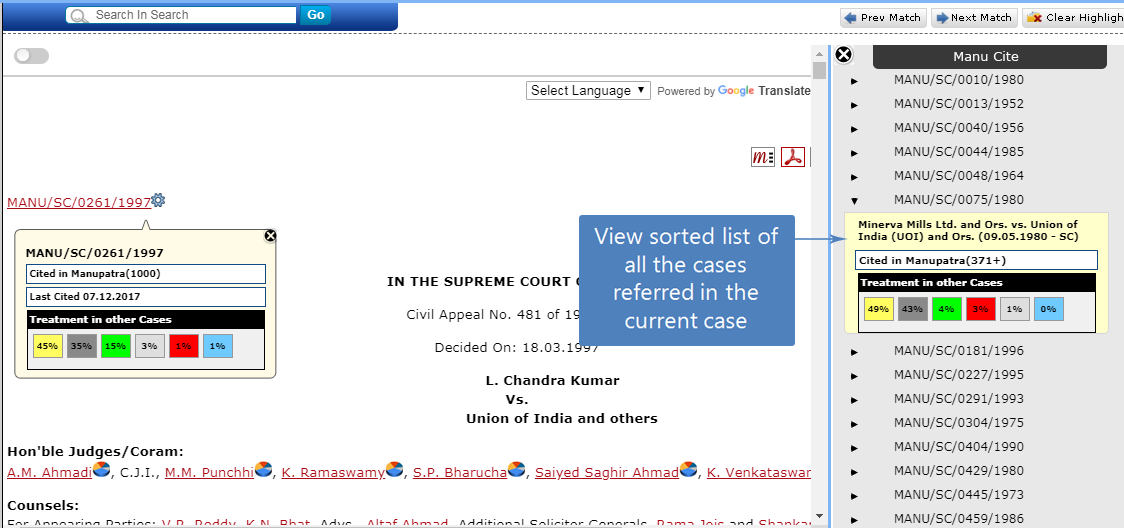 A gear like icon is shown beside every manuid mentioned/linked in a document, manu cite when clicked displays the number of times the judgment has been cited in other judgments. The treatment of the subject case in other cases is also depicted. Manu Cite when clicked from the top bar displays a sorted view of all the manuids mentioned in the selected judgment along with their cited count and treatment in other cases.