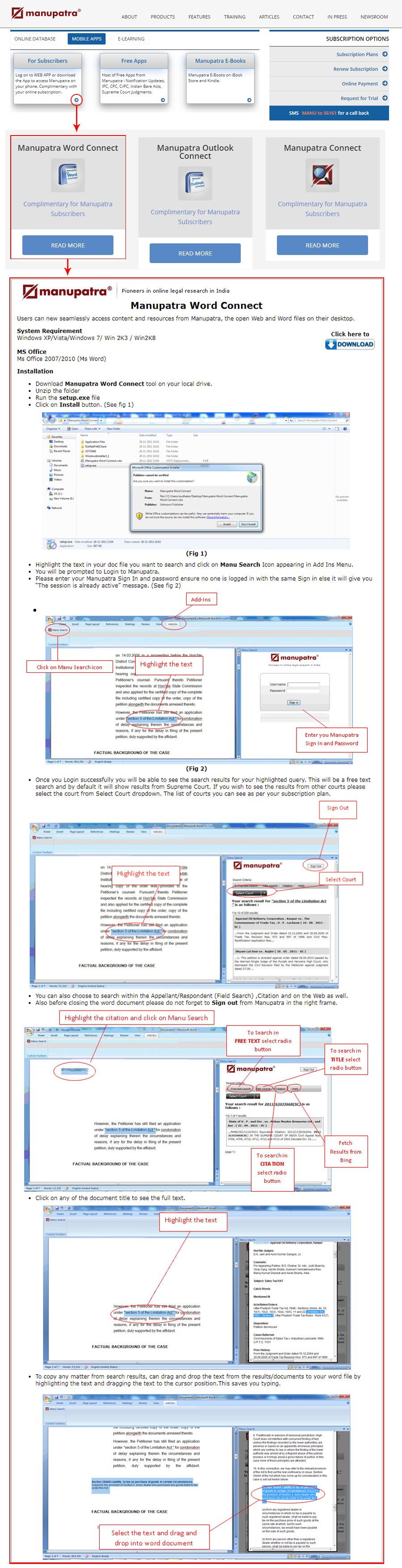 You can Download Manupatra Word Connect app from home page as below, it is complementary for all Subscribers.