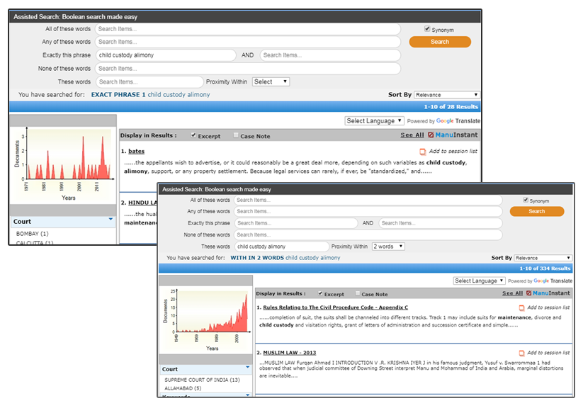 This interface gives you the single search box experience and assists you to search for key words, phrases, multiple phrases and more. You can perform Boolean search using Manu Search.
