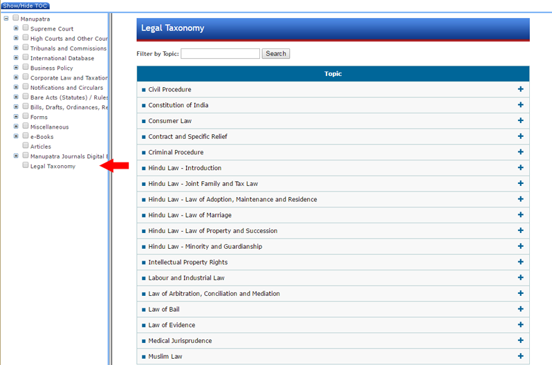 Manupatra Taxonomy is a hierarchical structure which lists the topics and the sub topics under that. The aim is that each topic covered, broadly reflects the terms associated with it as a user might expect to find it in major textbooks. It will aid the user in choosing keywords consistently and appropriately.