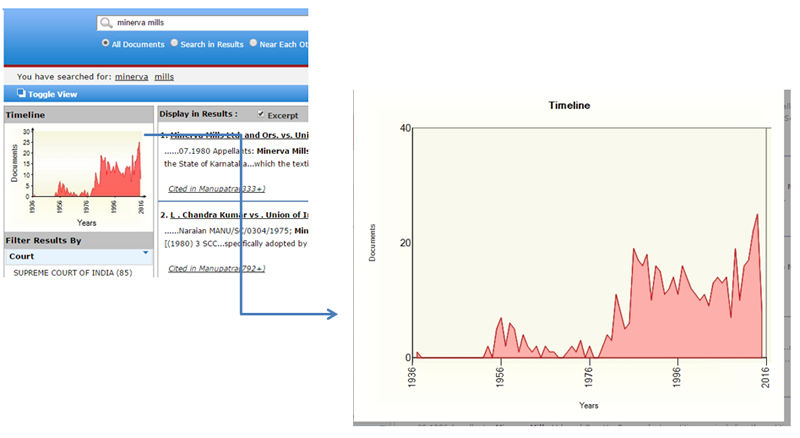 Graphical representation of the occurrence of cases in different years. This provides the user a quick information on the number of verdicts passed and as available in Manupatra database in graphical representation. This feature helps the researcher/ user to form a statistical opinion on prevailing prominence of legal issue during a particular year range vis-a-vis verdicts passed by the respective Courts, Tribunals and Commissions, Notifications as covered in Manupatra database.
