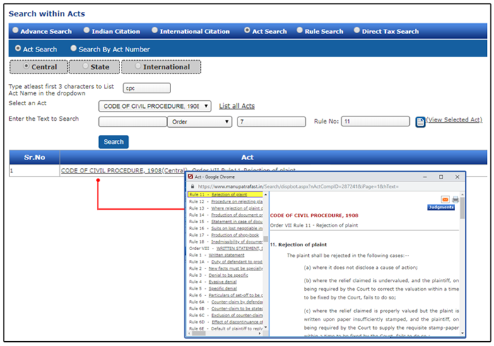 In the Act Search the user has an option to search Order & Rule in combination as well. e.g. CPC order 7 Rule 11.