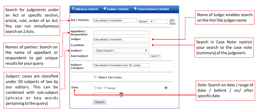 The case laws in Manupatra are divided into fields. Each field contains a specific information (e.g., appellant/respondent name, judges name, equivalent citation, subject, judge name, citation, acts, rules, order etc). Legal search allows you to search on a specific field or a combination of fields.